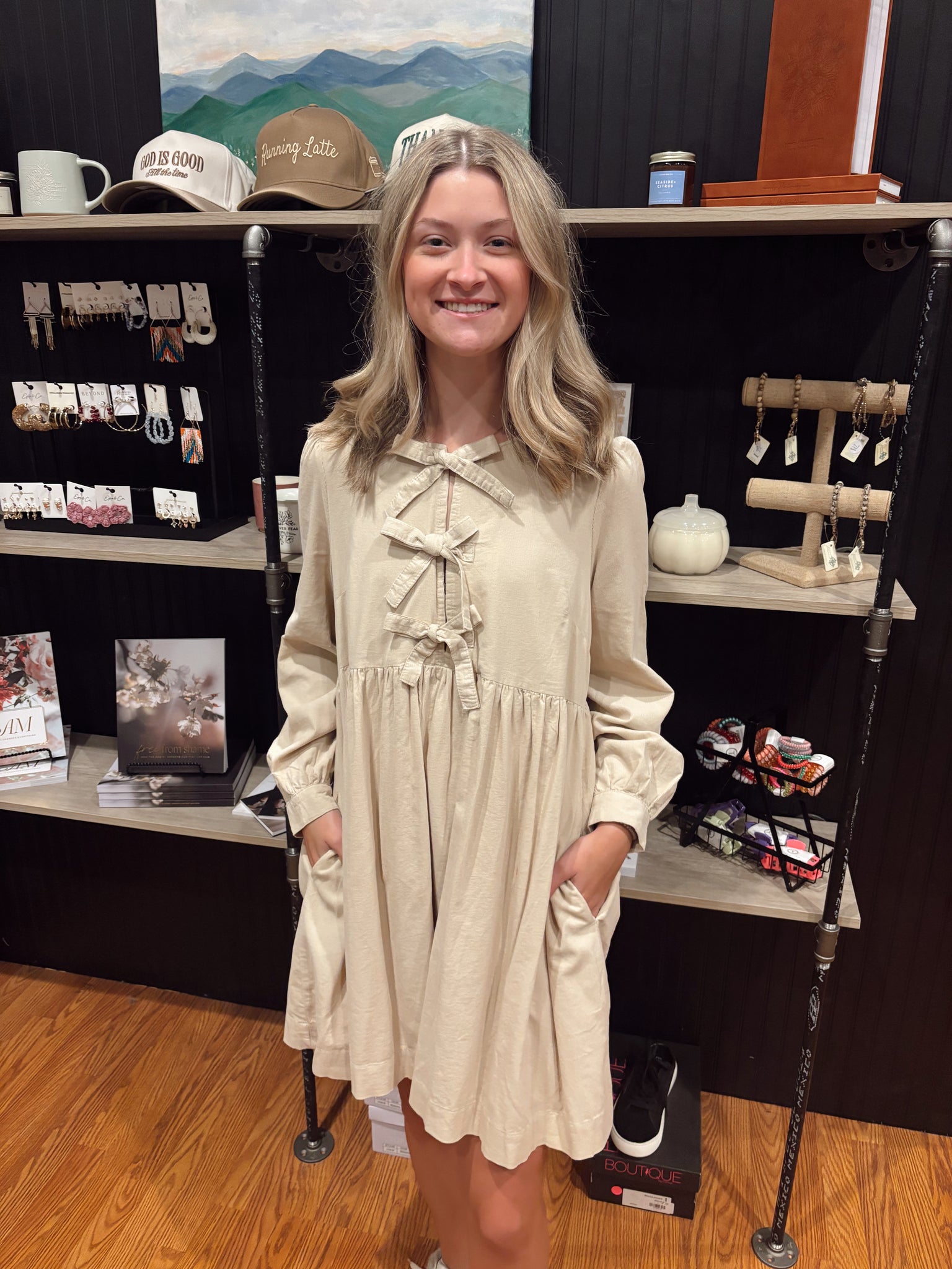 This is a sweet and cozy piece for cooler days. Velvet babydoll mini dress features: - Soft, textured cotton corduroy fabrication - Relaxed babydoll silhouette for a comfortable, flowy fit - Long sleeves with gathered cuffs - Charming front tie details with functional bows - Mini length for a playful yet modest look - Side pockets for added functionality - Lined