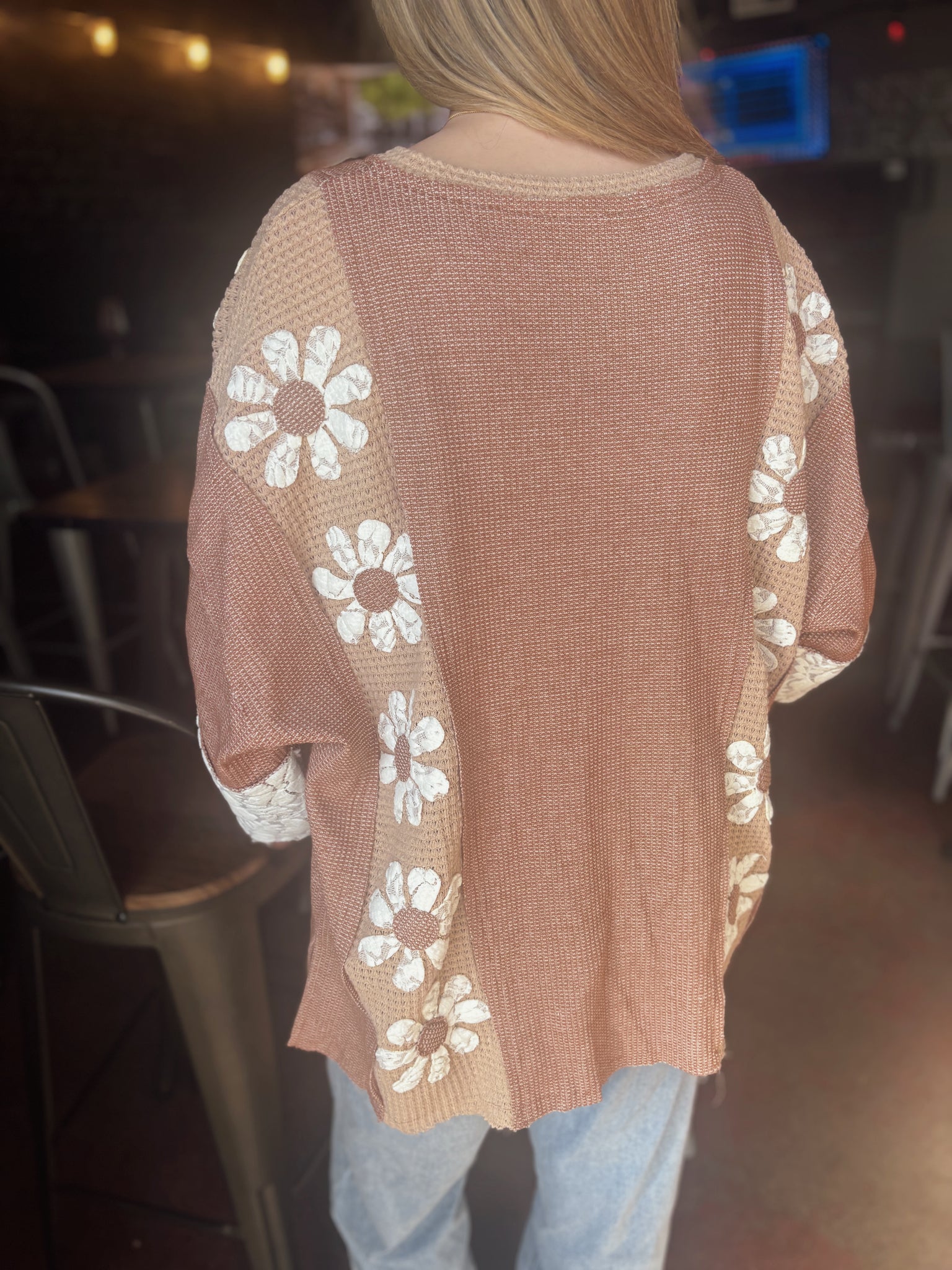 Waffle Knit Lace Flower Pullover Top (S-3XL)