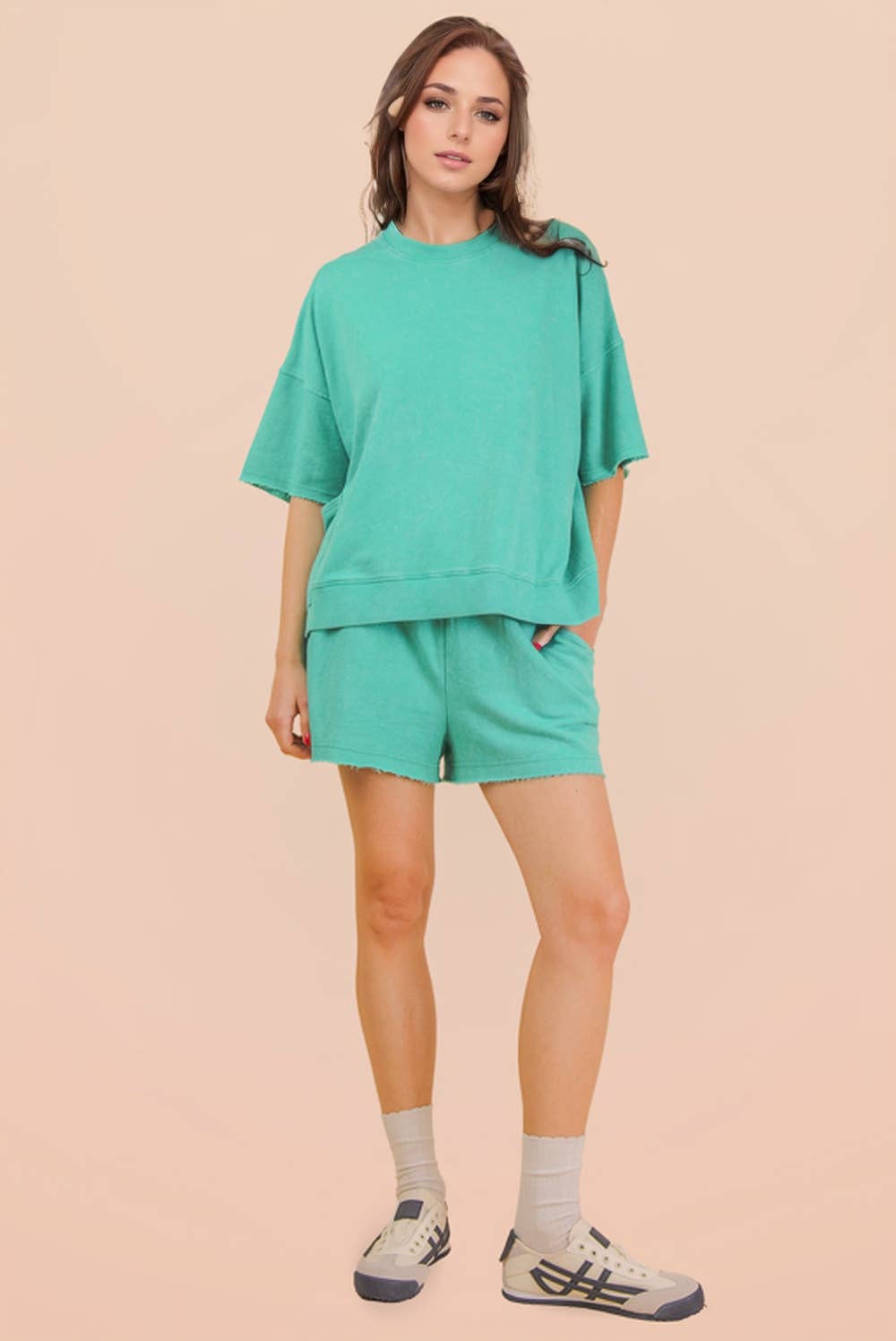 Mineral Washed Knit Casual Top & Shorts - Raw Edge Detail - Oversized - Short Sleeve - Round Neck - Side Patch Pocket BOTTOM - Elastic Waist W/ Tie - Side Pockets