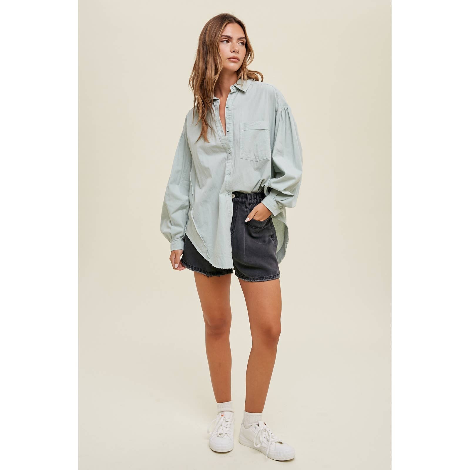 COTTON BALLOON SLEEVE SHIRT WITH SIDE SLITS - FUNCTIONAL BUTTONS AND POCKET, RELAXED, CASUAL 100% COTTON