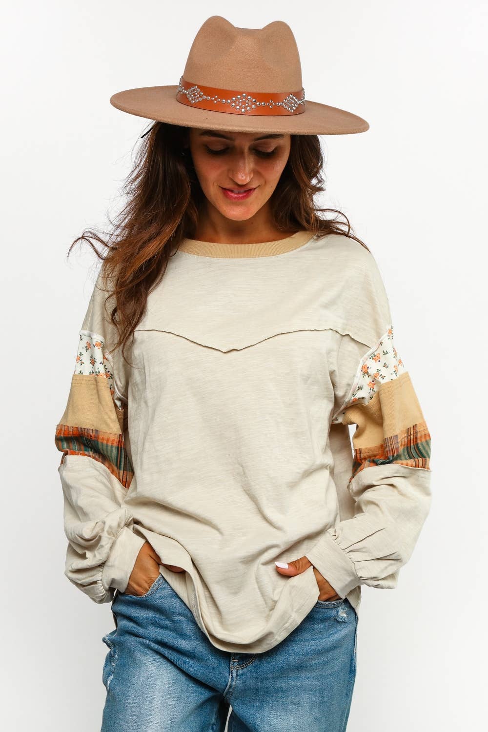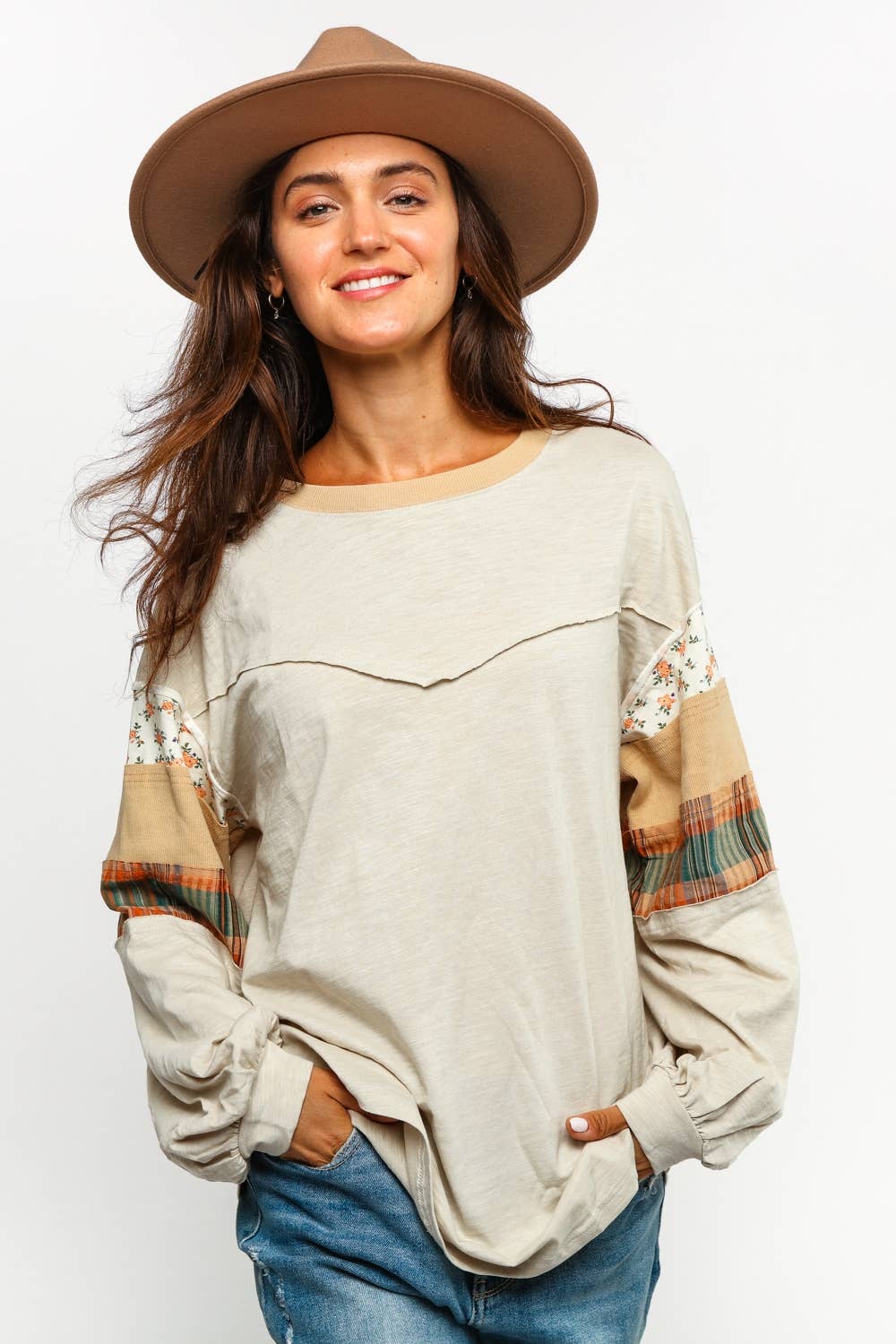 ROUND NECK DROP SHOULDER OVERSIZED LOOSE FIT YOKE FLORAL PRINT PLAID CHECK COLOR BLOCK LONG SLEEVE COTTON KNIT TOP WITH CUT EDGE DETAIL